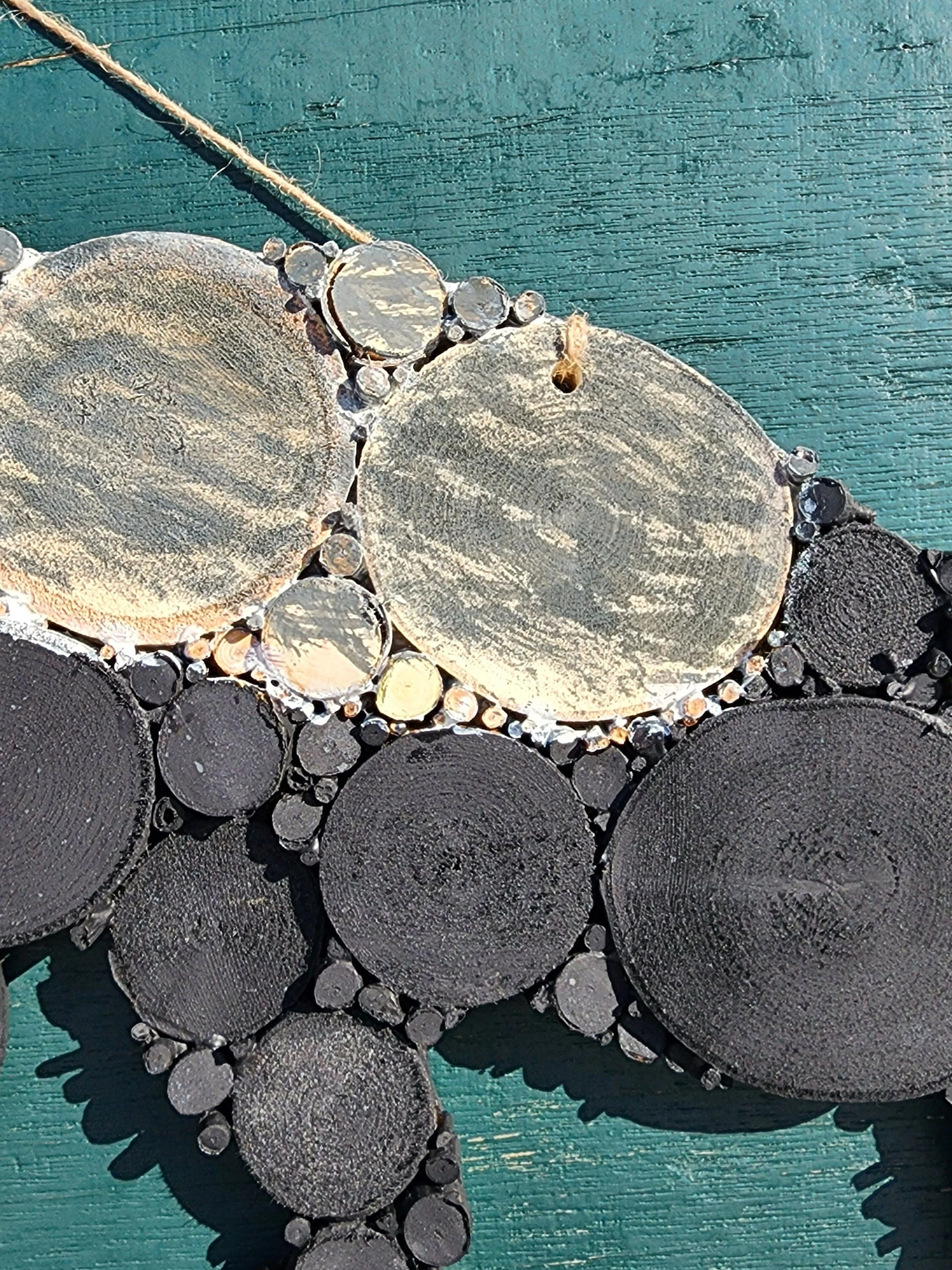 The fallen trees are cut into various size wooden rounds. They are glued onto a birch wood backer with a clear waterproof construction adhesive. It is then covered with a wood stain and/or paint wash to give it color but also let the natural wood grain show through. It is then coated in a water-based acrylic topcoat to help with moisture resistance. They are a great addition to your front door, porch, gazebo, or any wall!